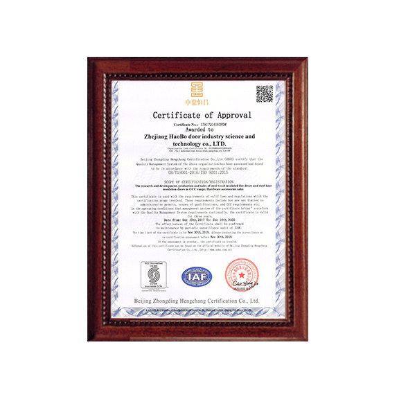 公司一直以來嚴格執行ISO9001質量體系和ISO14001環境管理體系標準,建立了完備的科研、開發、生產、銷售服務體系。公司是浙江省門業協會會員單位,江山門業協會理事單位,中國木材與木制品流通協會會員單位,江山市消防協會副會長單位。